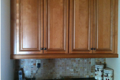 Starmark Cherry Cabinets With Mocha Stain With Caesarstone Dreamy Marfil Quartz And Marble Mosaic Kitchen Cabinets In Bathroom Cherry Cabinets Kitchen Remodel